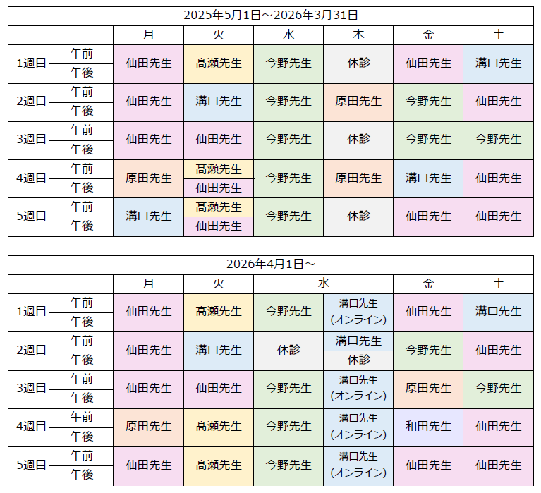 2026年4月より、以下の通り診療スケジュールを変更させていただきます。